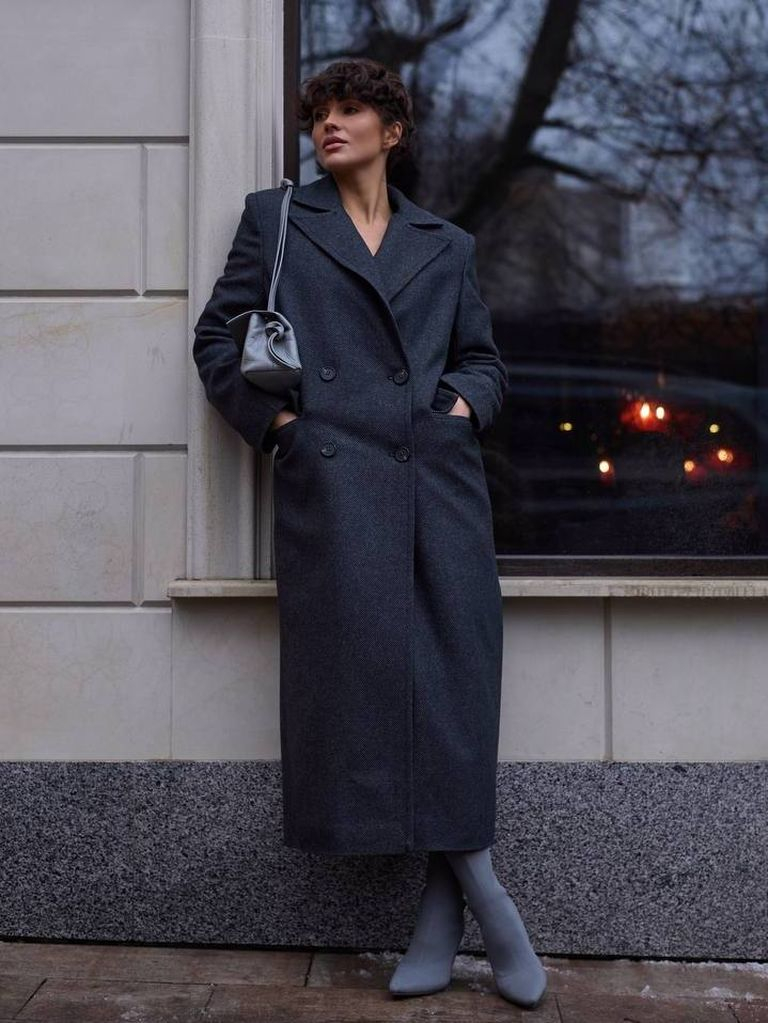 Пряме довге зимове пальто з підплічниками створює зібраний, виразний силует із чітким характером. Модель виконана з щільної пальтової тканини з діагональним плетінням, яке додає фактурності. Тканина добре тримає форму, забезпечує тепло й виглядає структуровано навіть у щоденному носінні. Крій прямий, збалансований за об’ємом і не перевантажений, тому пальто не виглядає значно оверсайз, але дозволяє комфортно вдягати під низ теплі речі, зокрема гольфи або об’ємні светри. Маскулінні плечі з підплічниками формують чітку лінію верху та додають образу впевненості. Двобортна застібка на ґудзики створює акуратну посадку, а широкі лацкани додають класичної елегантності. Рукави довгі, втачні, зі стриманим низом, що робить модель універсальною для різних стилізацій. Комір можна загорнути всередину, щоб прикрити шию в холодну погоду або поєднати з шарфом, змінюючи настрій образу. Це пальто стане базовим елементом зимового гардероба, який легко вписується як у мінімалістичні, так і в більш акцентні образи, поєднуючи стриману естетику з сучасною маскулінністю.