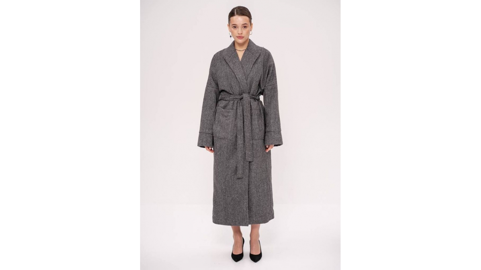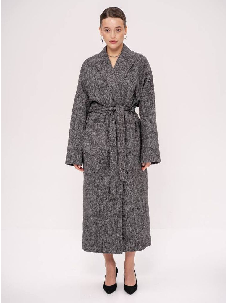 Форма кімоно додає виробу об’єму та свободи. Спущена лінія плечей і м’який силует створюють ефект розслабленої елегантності, а запах і пояс дають змогу регулювати посадку: підкреслити талію чи залишити образ невимушено вільним. Широкі лацкани красиво лягають на грудях, а глибокі кишені додають практичності.
