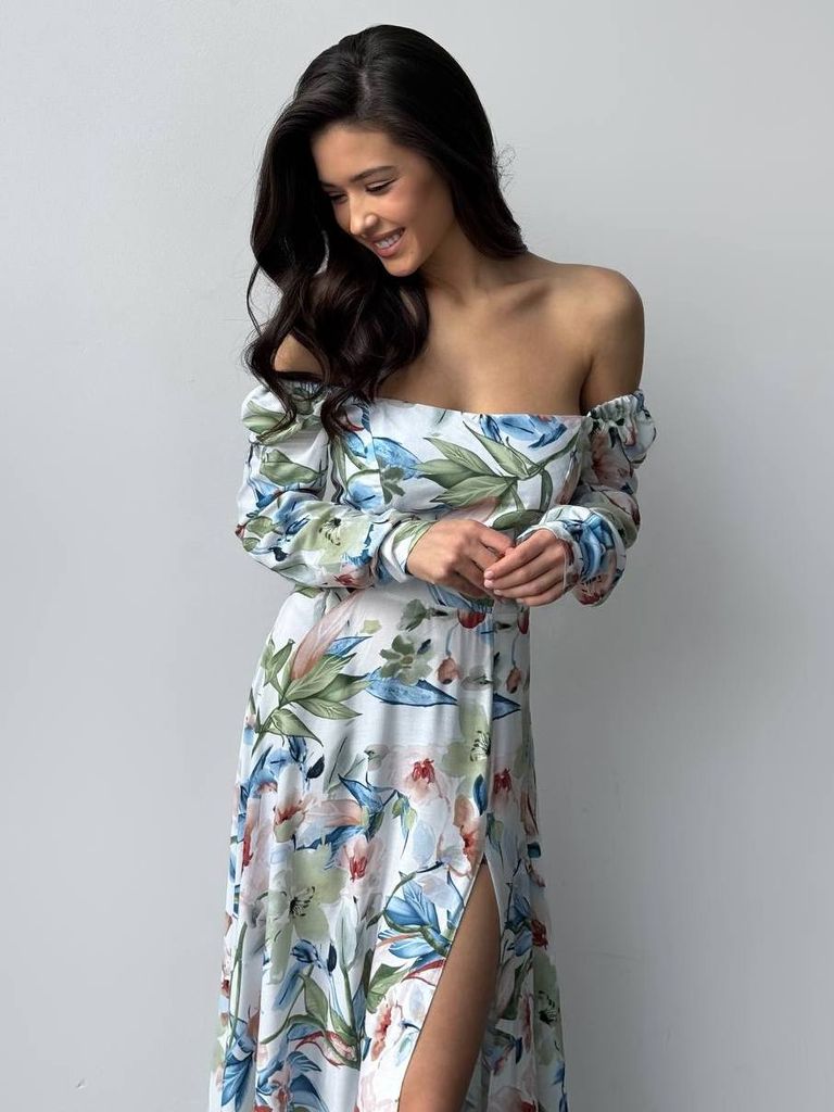 Силует сукні напівприталений, що делікатно окреслює форми, не сковуючи рухів. Довгі рукави з подовженим кроєм і невеликим об’ємом у плечах додають витонченого акценту, а гумка на плечах дозволяє носити сукню двома способами — класично або зі спущеними плечима. Виріз прямокутний, що гармонійно підкреслює зону декольте, а розріз на ніжці додає легкості та витонченості рухам.