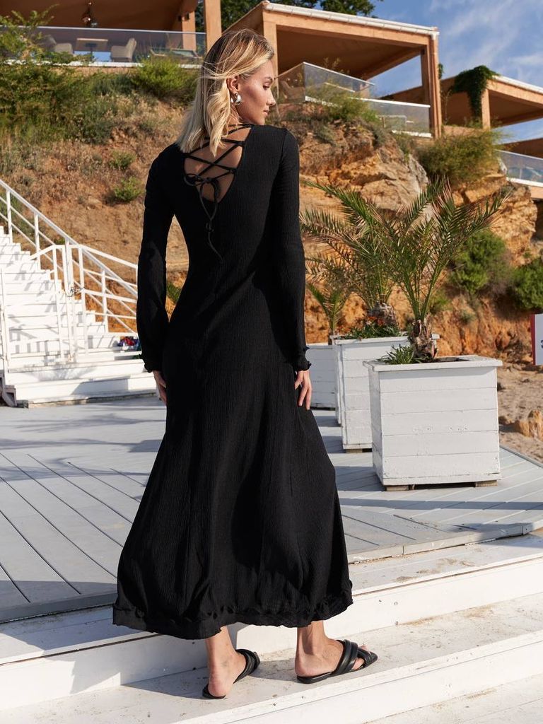 Довга трикотажна сукня по фігурі виконана з тканини з еластичної жатим ефектом. На спинці широка ефектна шнурівка, виріз неглибокий. Тканина легка. Рукави довгі, трошки розширені донизу. Спереду повередині та на рукавах декоративний об'ємний шов. Поділ А-силуету, оформлений шком, що створює ефект рюши. Замовити та купити чорну довгу сукню жатку з шнурівкою на спині з довгими рукавами недорого можна в нас накладним платежем з передоплатою на доставку. Відправляємо в Київ, Дніпро, Житомир, Львів, Запоріжжя, Тернопіль, Одесу, Івано-Франківськ, Суми, Кропивницький, Полтаву, Черкаси та будь-який населений пункт України.