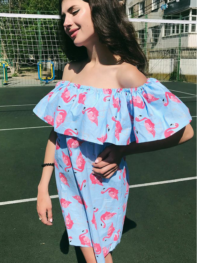 Натуральна бавовняна сукня з рожевими фламінго прямого силуету. Верх виконаний у вигляді об'ємного волана на резинці. Можна носити, спускаючи на обидва плечі або на одне, а також із круглим вирізом-човником. Тканина натуральна, не парить. Вільний крій дарує відчуття свободи та комфорту.
