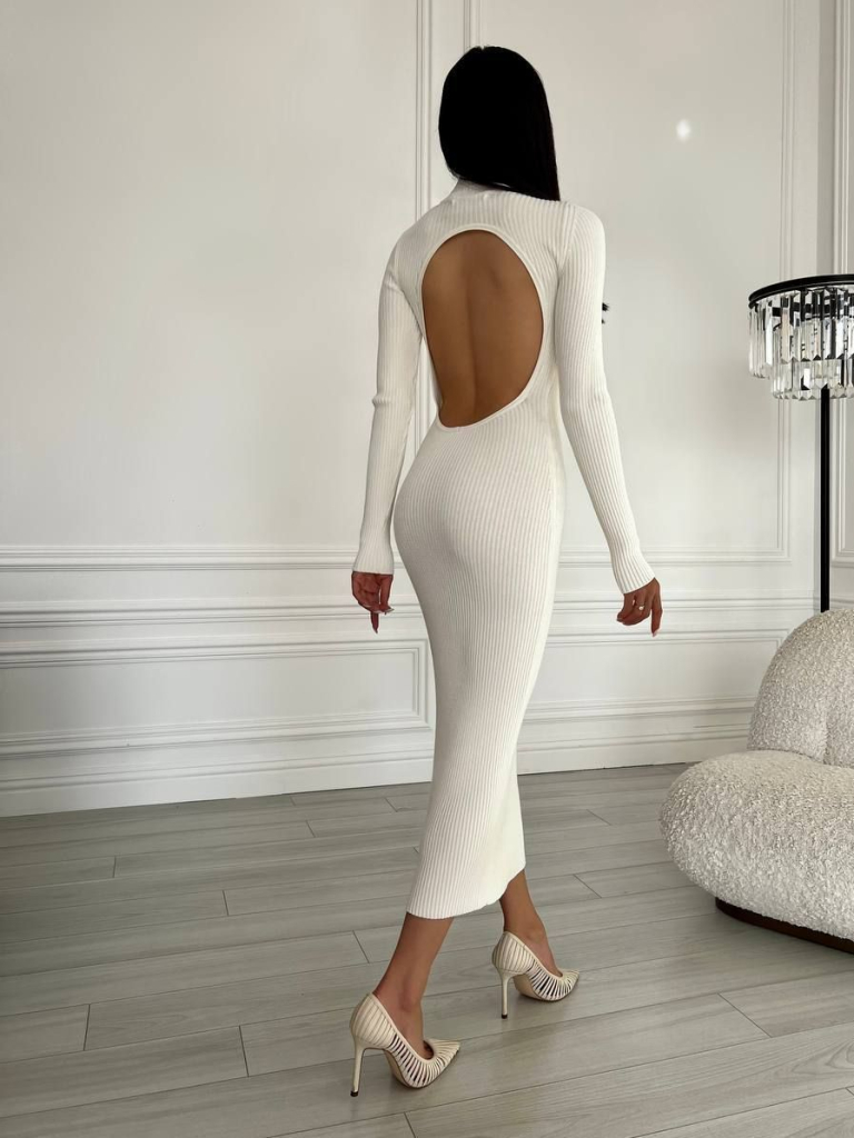 Дивовижне плаття із трикотажу в рубчик із шикарним натуральним складом. Сексуальна модель, яка вигідно наголошує на фігурі. Довжина міді, лаконічна та елегантна. Декольте закрите, з невисокою горловиною стійкою. Фасон здається лаконічним та базовим, але одна деталь змінює враження – дивовижний виріз на спині ставить фінішний акцент, який одразу виводить образ на новий рівень.