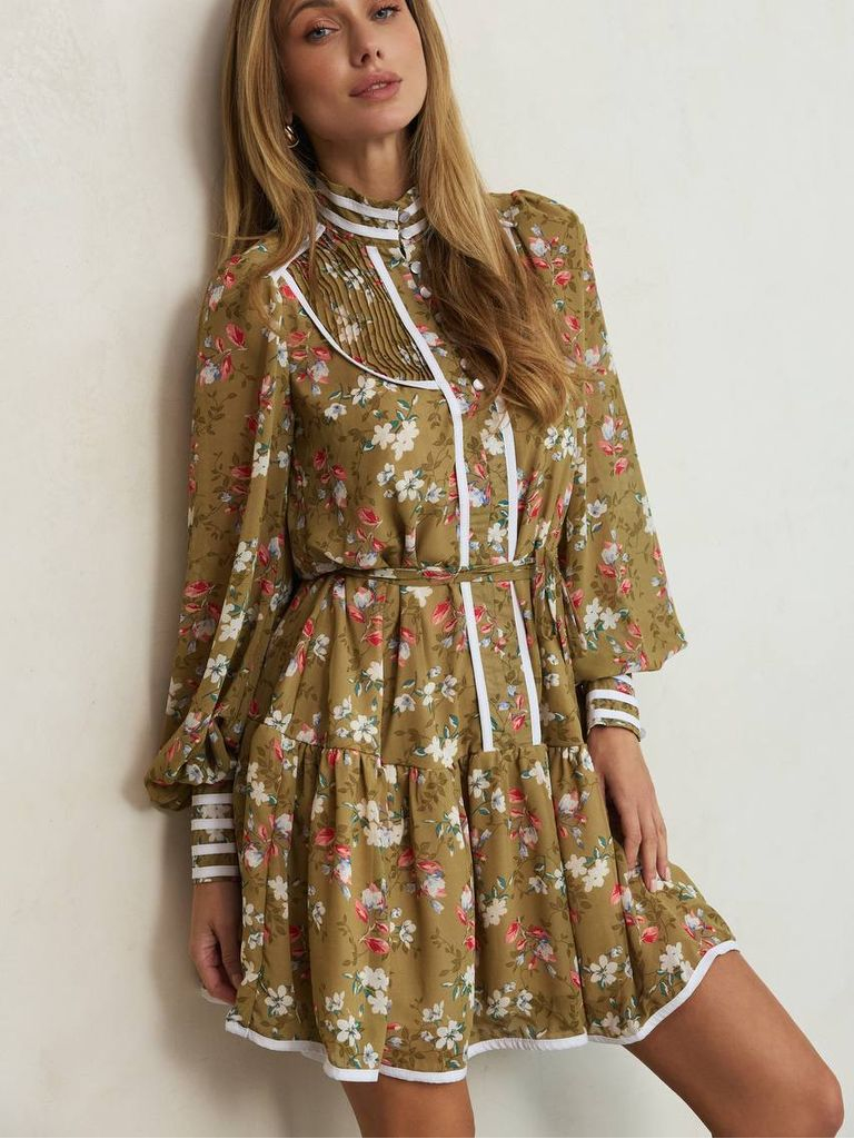 Пісочна шифонова квіткова сукня в стилі бохо випромінює легкість і романтику. Вишукані квіткові мотиви на ніжному фоні створюють відчуття гармонії з природою. Комір стійка з контрастними білими смужками додає класичної нотки, а перламутрові гудзики в зоні декольте роблять акцент на деталях. Довгі пишні рукави з широкими манжетами також оздоблені контрастними смужками, підкреслюючи витонченість моделі. Шифонова тканина на підкладці забезпечує легкість і комфорт, але не просвічується.