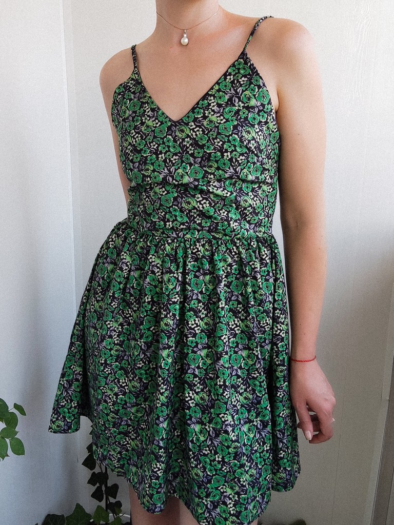 Чарівний легкий сарафан на тонких бретельках у гарному зеленому кольорі у дрібний квітковий малюнок. Гарно сідає по фігурці. Застібається потайною блискавкою. На спинці резинка, що гарно тягнеться. Посадка висока, підкреслює талію.