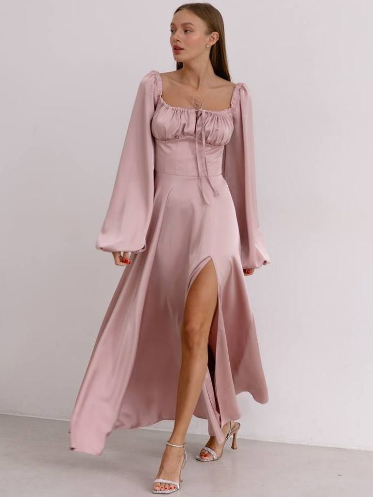 Розкішне вишукане плаття з якісного італійського сатину для урочистих заходів та важливих подій. матеріал не просвічується. Дуже гарний дизайн. Рукави пишні, гарно драпіруються. Можна оголювати плечі. Лінія грудей акцентована. Глибокий розріз на подолі з одного боку сексуально оголює ніжку.