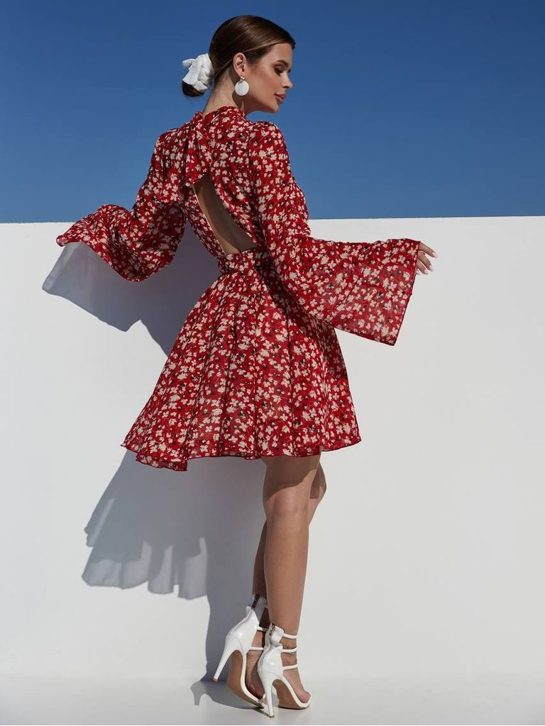 Легка повітряна сукня з довгими рукавами червоного кольору в ніжний квітковий принт. Приталена модель, акцент на талії. Рукави розширюються клином донизу, що створює додатковий об'єм та невагомість в образі. Декольте повністю закрите, комір невисокою стійкою фіксується зав'язками на спинці. Із зав'язок можна довільно сформувати бант будь-якої форми та розміру. Подол виконаний спідницею напів-сонцем, тому гарно розлітається та формує хвилі. Білий принт на контрасному червоному тлі виглядає яскраво. Родзинка образу - ефектний виріз на спинці. Завдяки крою спереду можна не надягати бюстгалтер, якщо немає потреби в підтримці грудей. Замовити та купити червону коротку шифонову сукню з довгими рукавами та відкритою спиною в квітковий принт недорого можна в нас накладним платежем з передоплатою на доставку. Відправляємо в Київ, Дніпро, Житомир, Львів, Запоріжжя, Тернопіль, Одесу, Івано-Франківськ, Суми, Кропивницький, Полтаву, Черкаси та будь-який населений пункт України.
