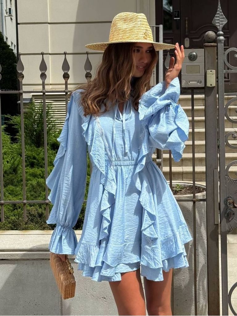 Комір-стійка акуратно декорований витонченим мереживом, що створює ніжний акцент біля обличчя. У зоні декольте елегантний виріз-крапля із зав'язками, який можна носити як злегка приспущеним для романтичного образу, так і зав'язаним для стриманішого вигляду. Від лінії плечей і донизу спереду тягнуться м'які повздовжні волани, які створюють живу, летючу динаміку силуету. Довгі об'ємні рукави закінчуються акуратною резинкою, що формує красивий волан. Окремий акцент — рюші-волани, що прикрашають рукави по всій довжині, підкреслюючи розкішний стиль моделі. Талія зібрана на м'яку резинку для зручної посадки і виразного силуету. Спідниця напівсонце гарно розкладається у русі, а низ прикрашений подвійною рюшею-воланом, додаючи легкості кожному кроку.
