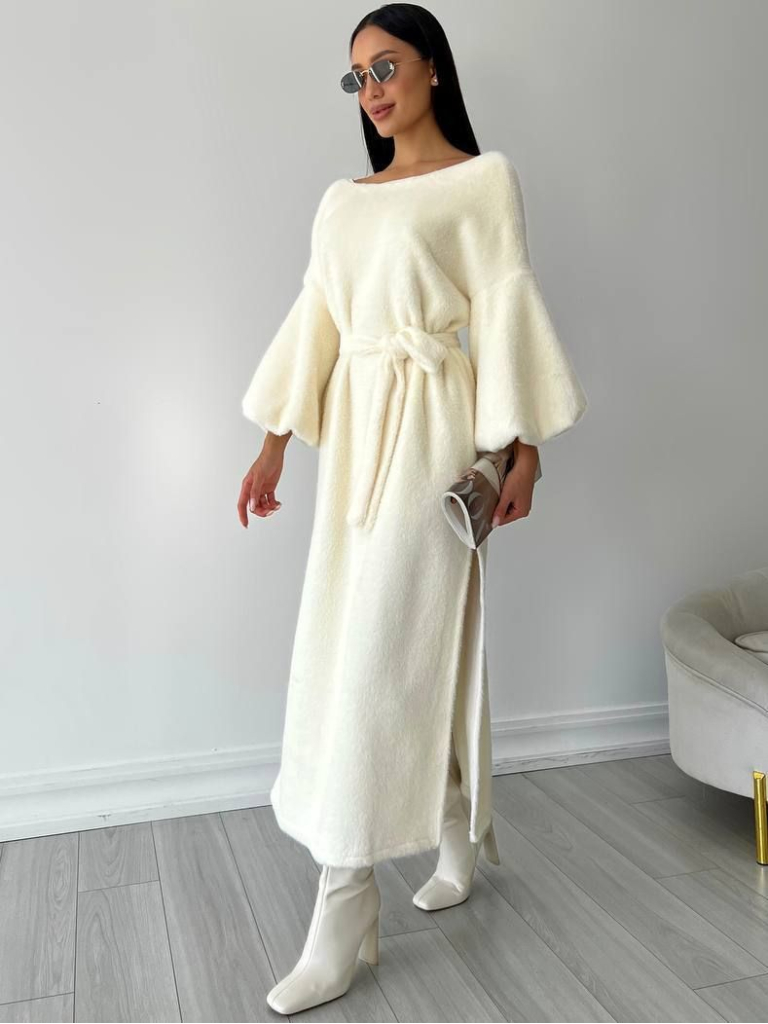 Затишна сукня з пухнастої тканини для холодної пори року. Модель доповнена елементами, що додають святковості. Довжина - подовжена міді. Пишні об'ємні рукави неповної довжини. Виріз горловини човником. На спинці трикутний виріз, що ефектно оголює частину спини, але достатньо комфортний для будь-якої білизни (не глибокий). З боків розрізи. Акцент на талії робить однотонний пояс, який можна пов'язати на власний смак. Замовити та купити теплу пухнасту сукню міді з пишними рукавами, поясом і розрізами з боків недорого можна в нас накладним платежем з передоплатою на доставку. Відправляємо в Київ, Дніпро, Житомир, Львів, Запоріжжя, Тернопіль, Одесу, Івано-Франківськ, Суми, Кропивницький, Полтаву, Черкаси та будь-який населений пункт України.