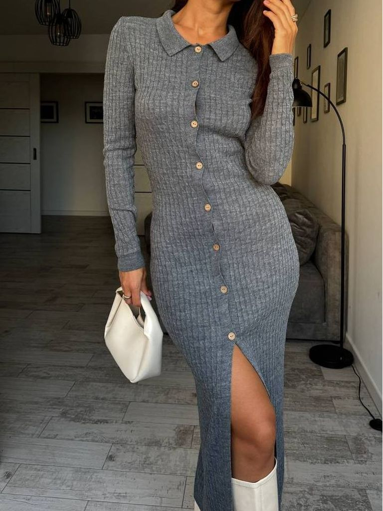 Акуратний відкладний комірець і горловина під шию створюють відчуття завершеності, надаючи образу вишуканої класики. Уздовж усієї довжини сукні проходить ряд делікатних дерев’яних ґудзиків, які не лише виконують функціональну роль, а й формують стильний акцент. У нижній частині вони відсутні, завдяки чому утворюється невеликий розріз, який надає виробу легкої відвертості й динаміки руху. Така деталь гармонійно врівноважує стриманий верх і додає сукні жіночності.