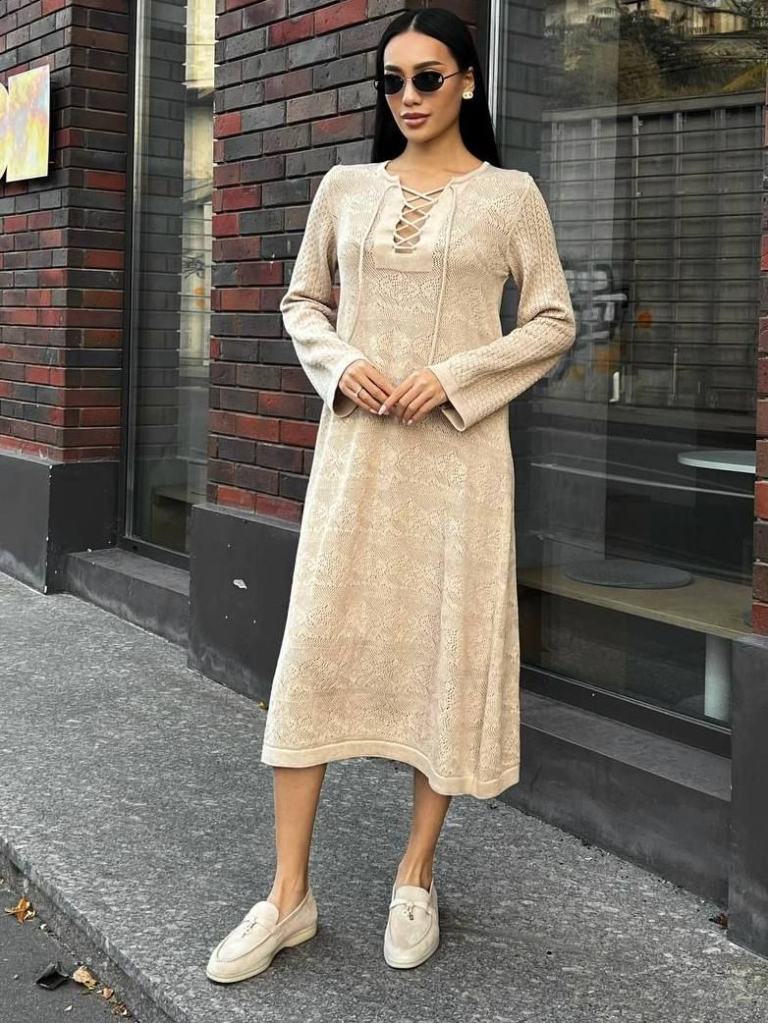 Безшовна в'язана сукня, що складається з верхньої сукні міді ажурного плетіння та нижньої сукні комбінації на тонких бретельках. Повністю натуральний склад пряжі. Тканина приємна, м'яка, не колеться, дозволяє тілу дихати. Особливої уваги заслуговують візерунки на верхній сукні. Квіткові мотиви прослідковуються на рукавах. Основна частина виробу прикрашена орнаментом. На декольте акцентна шнурівка. Рукави повної довжини, широкі, розслаблені. Ця модель сукні гарно поєднується з елегантним та спортивним взуттям. Замовити та купити в'язана ажурна сукня двійка з бавовни недорого можна в нас накладним платежем з передоплатою на доставку. Відправляємо в Київ, Дніпро, Житомир, Львів, Запоріжжя, Тернопіль, Одесу, Івано-Франківськ, Суми, Кропивницький, Полтаву, Черкаси та будь-який населений пункт України.