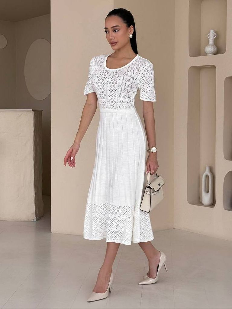 В'язана бавовняна ажурна сукня міді з коротким рукавом — це елегантний вибір для літніх днів та вечорів, коли хочеться відчувати себе комфортно і водночас виглядати вишукано. Виготовлена з бавовни й віскози, ця сукня поєднує в собі легкість натуральних матеріалів і приємну на дотик текстуру. Верх сукні виконаний у мереживній ажурній в'язці з геометричним візерунком, що створює ефект легкості, а також додає образу витонченості. Декольте має округлу форму та є неглибоким, що робить сукню більш стриманою і універсальною для різних випадків. Короткі рукави вільно сідають, не обтягуючи руки, що додає комфорту під час носіння.
