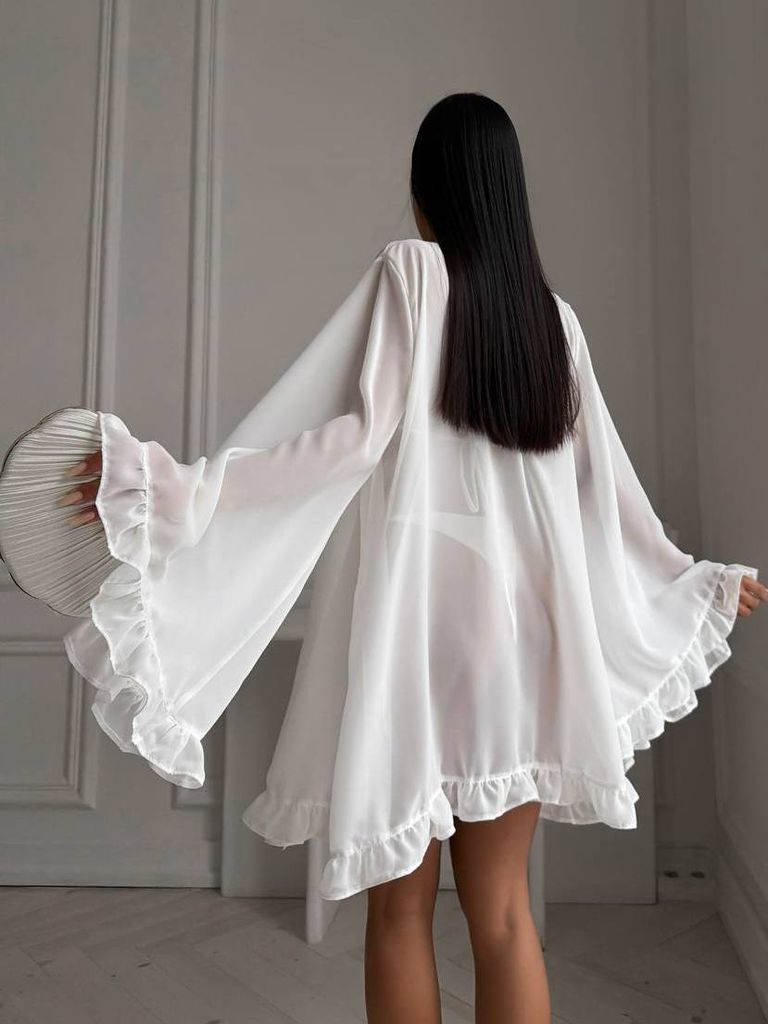 Рюші по низу та на рукавах додають жіночності і роблять силует більш плавним. Розширені рукави у стилі кімоно підсилюють відчуття легкості та створюють витончений силует. Така накидка стане елегантним доповненням до пляжного гардероба. Її можна носити поверх купальника на пляжі, поєднувати з літніми комплектами для прогулянок або використовувати як легкий акцент у курортних образах. Виріб компактний, не займає багато місця у валізі та завжди стане у пригоді під час відпочинку.