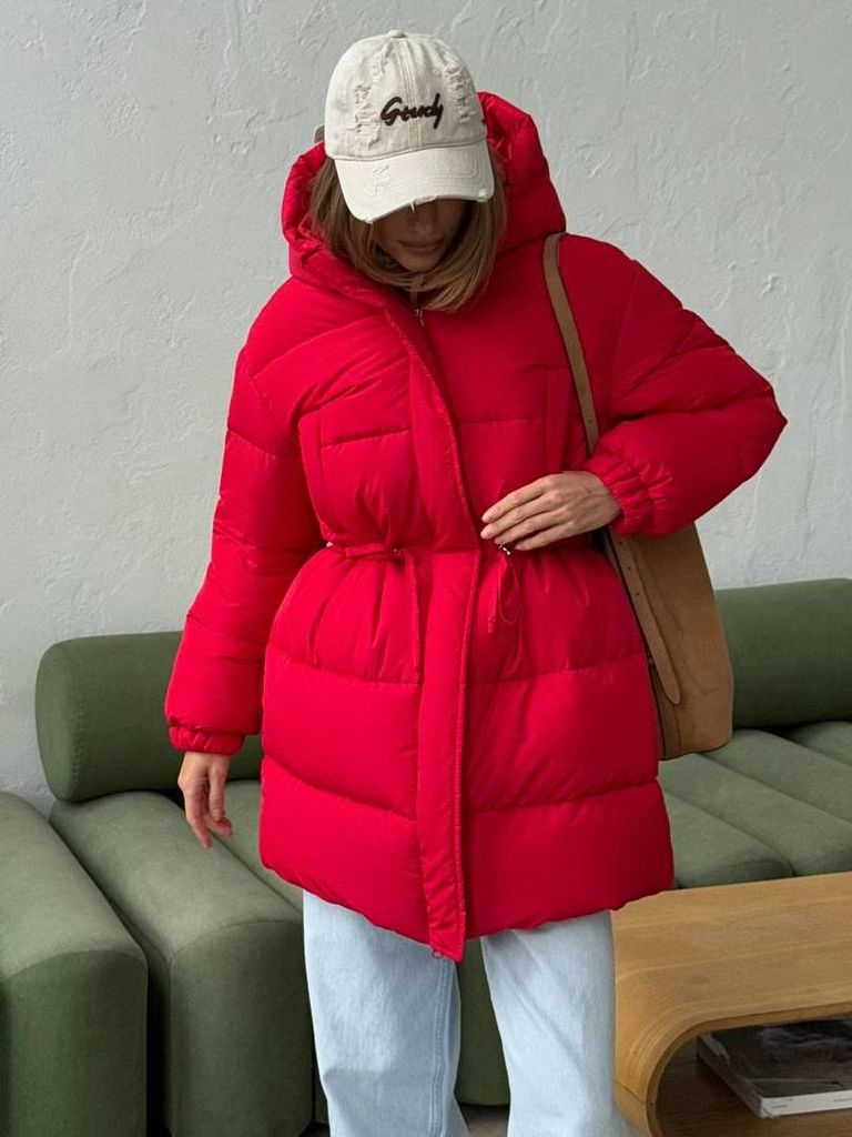 Якісний червоний зимовий пуховик подовженого силуету створений для максимального комфорту навіть у сильний мороз. Модель виготовлена з люксової плащівки, що не продувається й надійно утримує тепло. Наповнювач аеро-пух забезпечує легкість і високу теплоізоляцію, тому виріб комфортний при температурі до мінус двадцяти градусів. Капюшон не знімається, що гарантує додатковий захист від вітру та снігу.