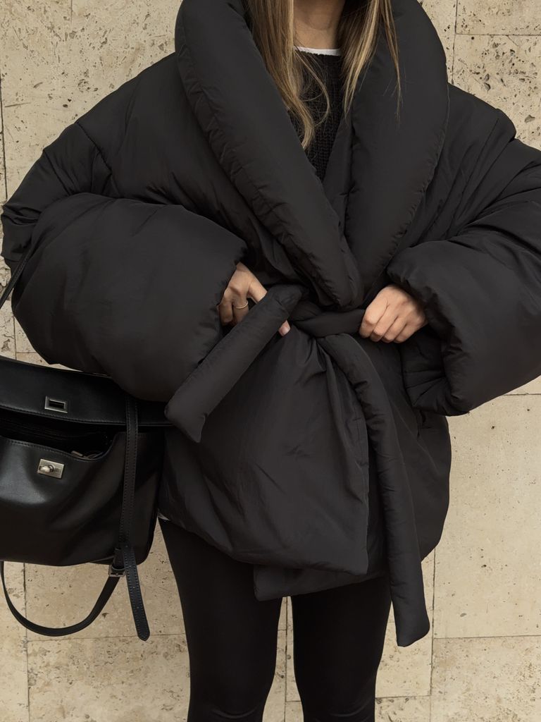 Чорний пуховик ковдра у виразному сучасному стилі не лишає без уваги та огортає затишком. Модель oversize посадки забезпечує свободу рухів і дає можливість комфортно стилізувати теплі зимові образи. Довжина прикриває стегна та зберігає тепло. Плащівка у поєднанні з наповнювачем синтипухом щільністю 300 утримує тепло навіть у сильні морози. Кімоно-крій на запах формує жіночний силует. Об’ємний комір дарує ефект закутаності та одразу підкреслює трендовість моделі. Широкі рукави, що розширюються донизу, підсилюють характер виробу. Пояс з плащівки в тон формує акцент на талії. Пуховик гарно поєднується з сукнями, спідницями, облягаючим низом. Підійде як до більш розслабленого стилю залежно від аксесуарів та взуття, так і до елегатних образів.
