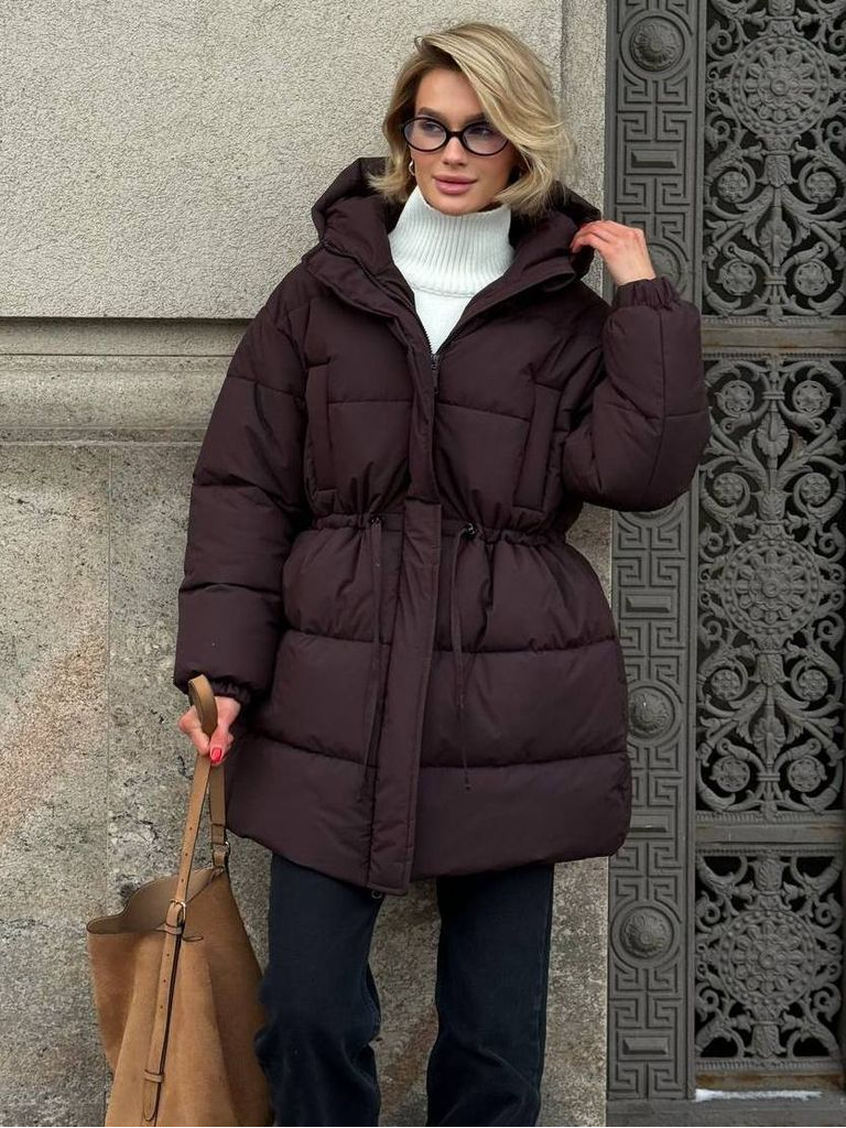 Шоколадний подовжений зимовий пуховик виглядає стримано та універсально. Матова тканина підкреслює глибину кольору, не дає зайвого блиску та робить модель максимально практичною для щоденного носіння. Матеріал надійно захищає від вітру та холоду, зберігаючи охайний вигляд у різних погодних умовах. Куліска дозволяє м’яко підкреслити талію або залишити силует більш прямим, змінюючи настрій образу. Наповнювач аеропух забезпечує збалансовану теплоізоляцію, завдяки чому в пуховику тепло, але не важко. Легкість матеріалу робить силует повітряним, без відчуття об’єму.
