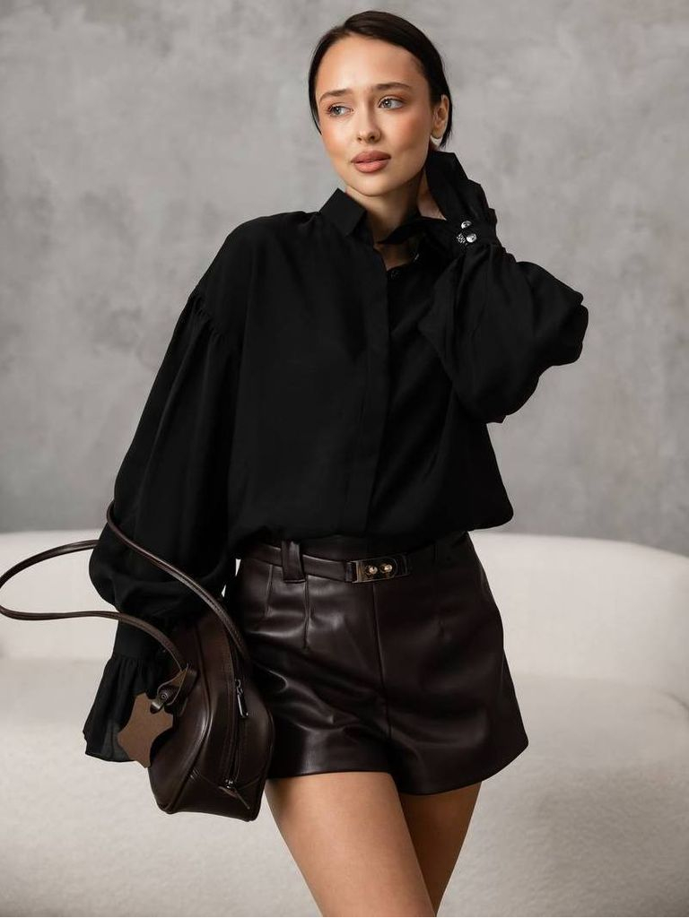Стильні шкіряні шорти з пряжкою — ідеальний вибір для елегантних міських образів. Виконані з еко-шкіри на замшевій основі, вони мають приємну текстуру та добре тримають форму. Шовкова підкладка забезпечує комфорт у носінні, а висока посадка красиво підкреслює талію. Фігурні виточки додають витонченості силуету, роблячи стегна виразнішими.