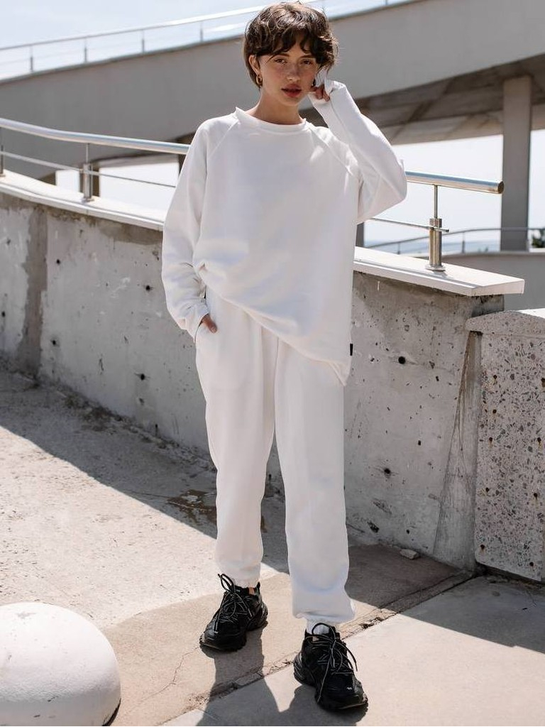 Білі тотал луки завжди виглядають неймовірно! А якщо ви хочете створити влучний, але при тому комфортний образ, білий спортивний костюм вільного крою підійде пречудово. Комплект складається з подовженого світшоту та зручних спортивних штанів, що мають манжети знизу. Дуже якісний матеріал - бавовна, що дозволяє тілу дихати, захищає від спеки і зігріває, коли прохолодно.