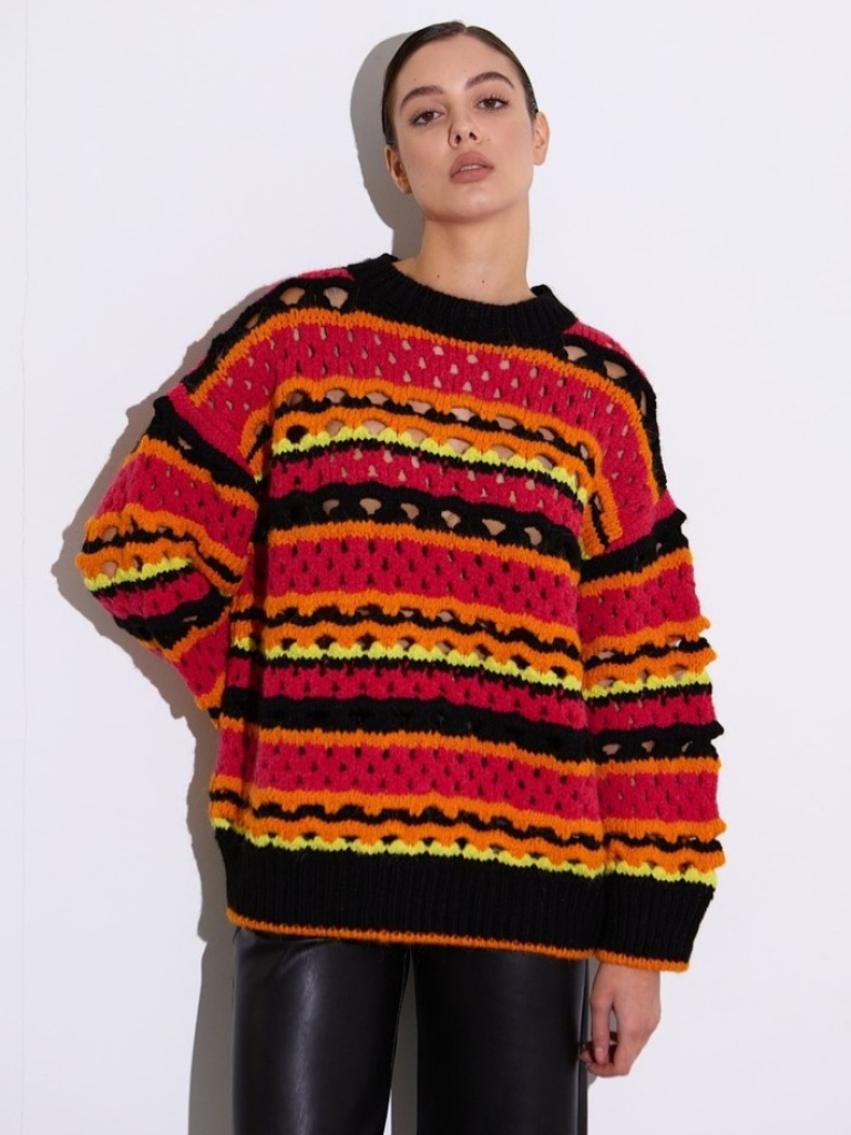 Різнобарвний насичений светр у смужки, що грає всіма кольорами веселки, підійме настрій у сіру погоду. Модель оверсайз, розслабленої посадки, зі спущеною плечовою лінією. М'який на дотик, приємний матеріал, що не колеться та не електризується. В'язка ажурна, незвична. Оригільний варіант для шанувальниць затишного, але не буденного одягу. Купити об'ємний смугастий різнокольоровий барвистий светр можна у нас накладеним платежем за передоплатою на доставку.