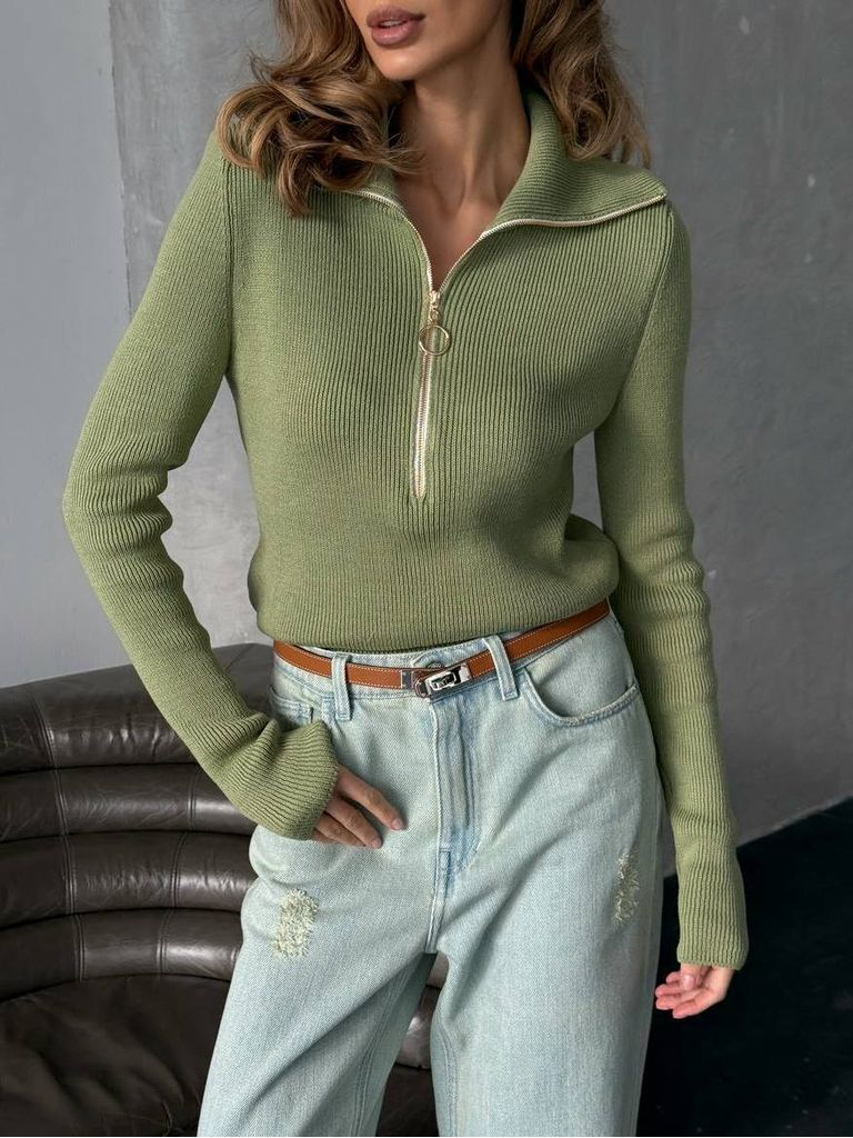Актуальний в’язаний джемпер з блискавкою на горловині створює відчуття сучасної гармонії форми й функціональності. Модель виконана з трикотажу в дрібний рубчик. Фактура приємна до тіла й достатньо щільна. Оптимальний склад із 50% вовни та 50% акрилу забезпечує тепло, еластичність і практичність у щоденному використанні. Блискавка із золотого металу додає виробу вишуканого акценту. У розстібнутому вигляді комір лягає м’якими відворотами по плечах, створюючи красиву лінію та додаючи образу жіночності. У застібнутому варіанті висока стійка надійно захищає шию й робить джемпер комфортним у вітряну погоду. Довжина блискавки до рівня грудей, тому можна регулювати глибину декольте. Посадка приталена, але розслаблена: джемпер не облягає надмірно, проте акцентує природні лінії фігури. Светр ідеально поєднується з широкими брюками, джинсами або спідницями А-силуету, створюючи візуальну рівновагу та витягуючи силует. Подовжені рукави відповідають актуальним тенденціям нового сезону.
