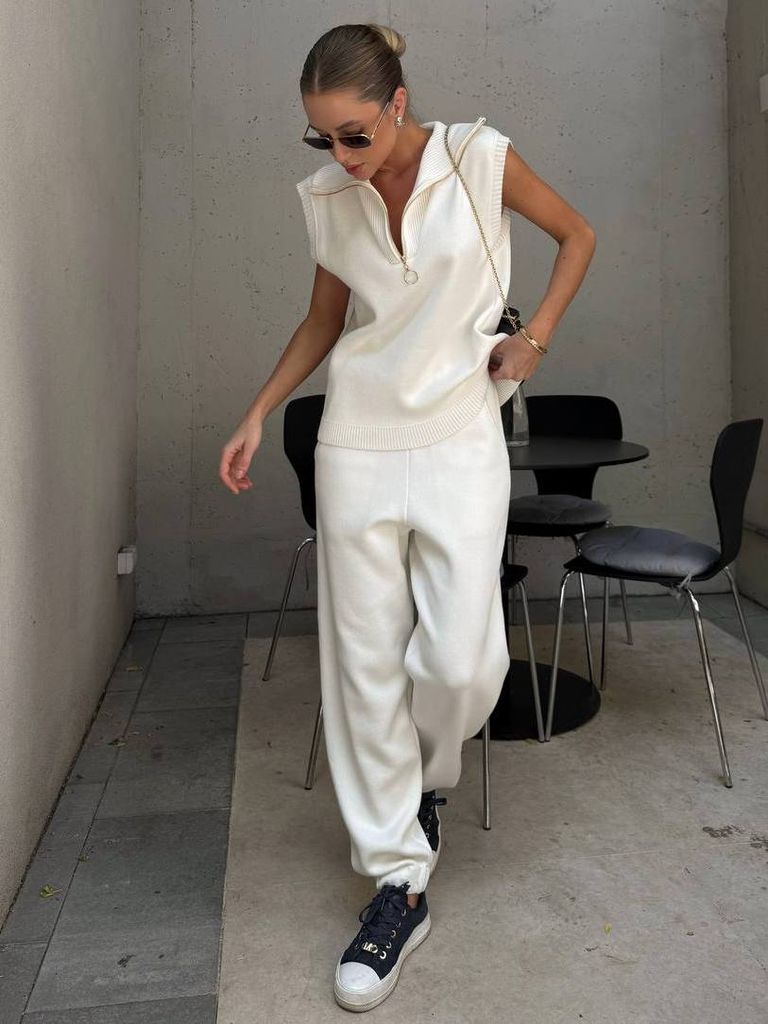 Топ у стилі поло без рукавів має стандартну довжину, широкі пройми з рубчастою обробкою та високий відкладний комір, який додає характеру. Золота фурнітура на змійці підкреслює дорожне звучання й дозволяє регулювати глибину декольте — від спортивної стриманості до романтичної грайливості. Штани з високою посадкою, вільного крою, зручні завдяки еластичній талії й манжетам на гумках. Бічні кишені додають функціональності, а загальний силует зберігає баланс між комфортом і естетикою. Ідеальний вибір для тих, хто цінує простоту, яка виглядає дорого.