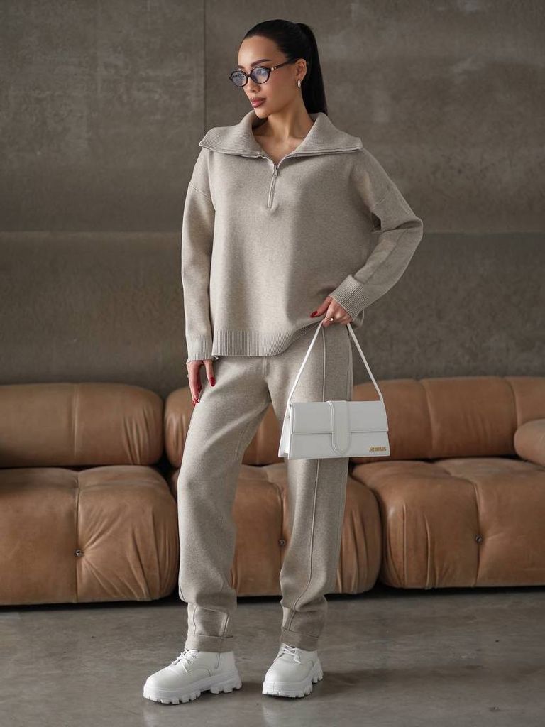 Кашеміровий трикотажний костюм з джемпером на змійці створений як універсальний преміальний комплект для щоденного гардероба, у якому комфорт поєднується з елегантністю. Модель виконана дрібною машинною в’язкою, що виглядає акуратно, рівно та благородно. Костюм в’яжеться в Україні з нуля на професійних станках, а не шиється з готового полотна, завдяки чому має кращу посадку та стабільну форму.