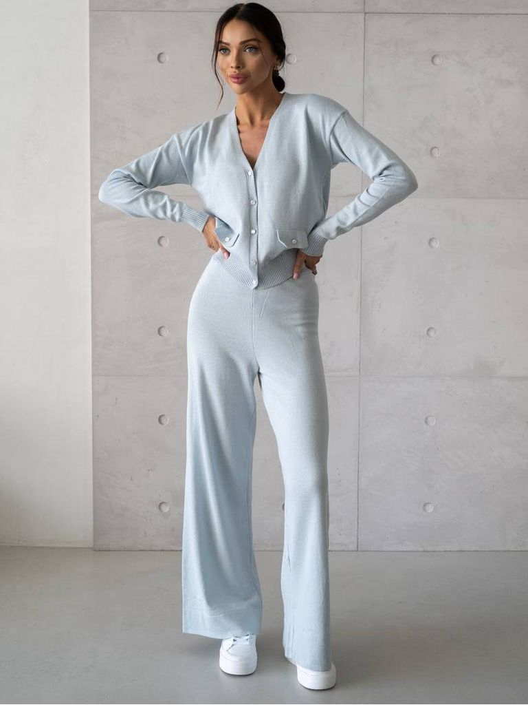 Елегантний брючний костюм дрібної трикотажної в'язки виконаний з преміальної пряжі з натуральним складом. Приємний до тіла, м'який, зносостійкий. Верх представлений укороченим кардиганом на акуратних перламутрових ґудзиках. Рукави повної довжини. Імітація кишень, клапани також декоровані ґудзиками. Широкі штани з в'язкою гумкою на талії, високої посадки, прямого крою. Ідеальний костюм для прохолодної погоди в міжсезоння або в якості нижнього шару на холодний сезон. Замовити та купити костюм з кардиганом і широкими штанами дрібної в'язки недорого можна в нас накладним платежем з передоплатою на доставку. Відправляємо в Київ, Дніпро, Житомир, Львів, Запоріжжя, Тернопіль, Одесу, Івано-Франківськ, Суми, Кропивницький, Полтаву, Черкаси та будь-який населений пункт України.