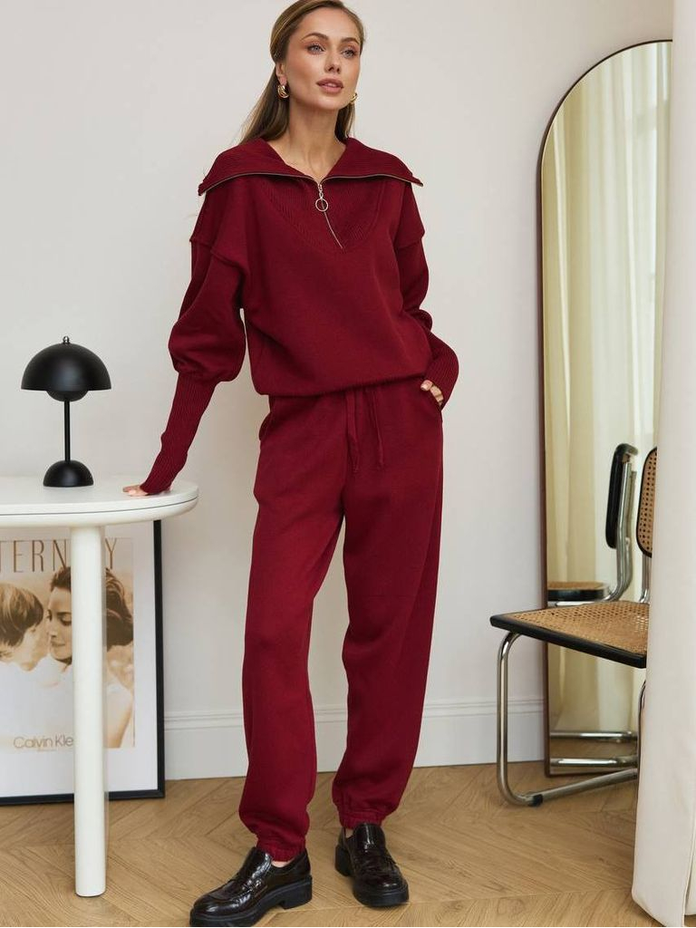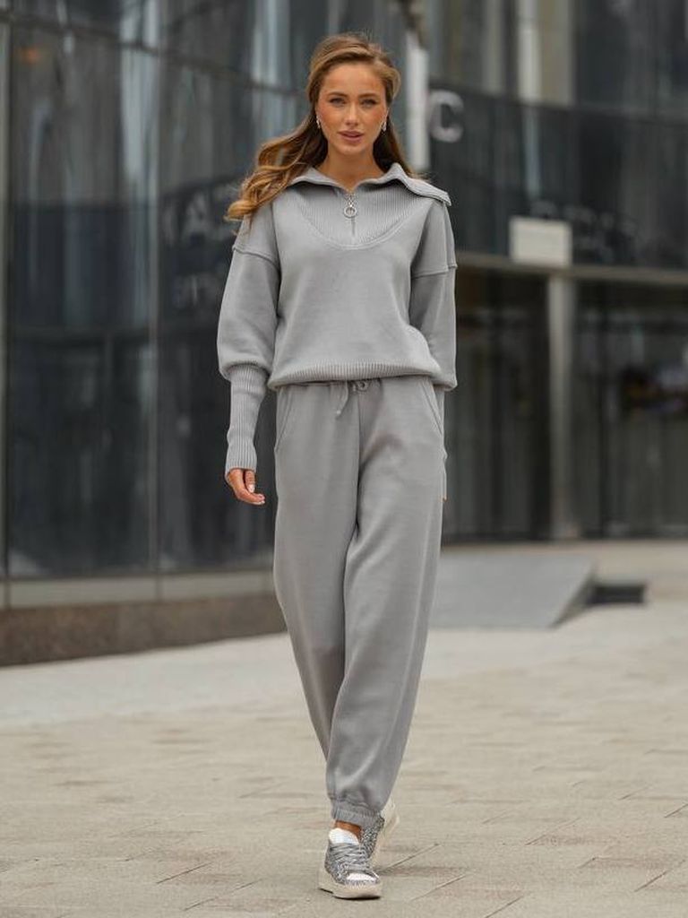 Вишуканий в'язаний костюм з преміальної лінійки українського виробництва. Для пошиву використана якісна італійська пряжа вищого гатунку. Костюм дрібної в'язки має елементи, притаманні звичайному спортивному костюму - манжети на штанах, кармани, шнурок регулятор об'єму, гумку на талії. Родзинкою виступає світшот незвичного крою - дрібний рубчик на рукавах доходить до ліктя, верхня частина рукава більш об'ємна, що створює стильну посадку. Виріз декольте оформлений вставкою фактурної в'язки та функціональною металевою застібкою. При розстібанні блискавки формується великий гарний комір. Кофта приталена знизу в'язкою резинкою. Посадка штанів висока та зручна, можна за бажанням спускати нижче. Штани прямого крою, вільні. Завдяки натуральній мериносовій пряжі костюм буде довго носитися, забезпечувати терморегуляцію у прохолодну погоду. У складі також є бавовна. Ідеальний костюм на весну та осінь.