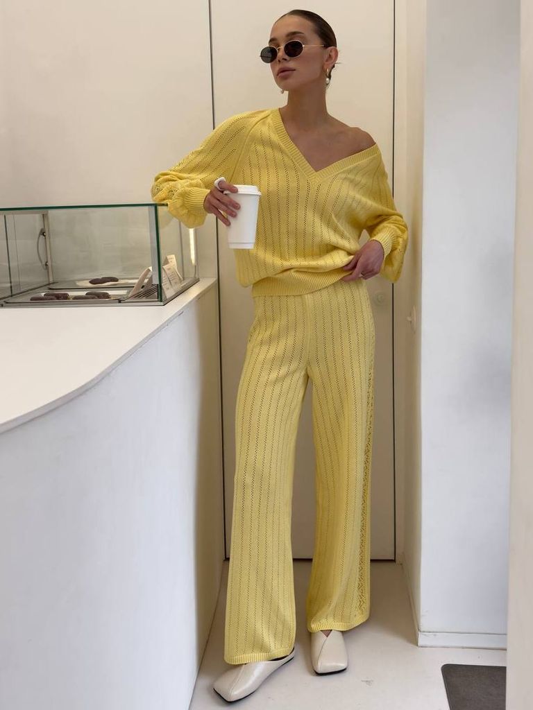 Цей неймовірний костюм з люксової натуральної пряжі стане справжнью знахідкою на прохолодну погоду. Завдяки бавовні в складі тканина дихає, не парить в спеку та зігріває в холод. Комплект складається з вільного светра та широких брюк палаццо. Кофтинка має трикутний виріз декольте. Низ виробу, рукави та горловина оброблені в'язкою гумкою. На рукавах ажурний орномент, який повторюється на штанах замість канту з боків. Посадка штанів широка. Дрібна перфорація створює іллюзію рубчика. Штани високої посадки, на резинці. Замовити та купити бавовняний трикотажний брючний костюм з ажурними вставками та широкими штанами недорого можна в нас накладним платежем з передоплатою на доставку. Відправляємо в Київ, Дніпро, Житомир, Львів, Запоріжжя, Тернопіль, Одесу, Івано-Франківськ, Суми, Кропивницький, Полтаву, Черкаси та будь-який населений пункт України.