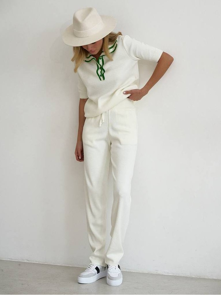 Лаконічний костюм з в'язаного бавовняного дрібного трикотажу українського виробництва. Чудова якість сировини, акуратний пошив. Верх представлений футболкою поло з короткими рукавами та коміром, що має контрастні акцентні смужки. Гудзики функціональні. Штани високої посадки з широким поясом чудово сідають на талію, підкреслюють її. Є шнурівка для зав'язування. Крій штанів прямий, довжина повна. Зріст моделі на фото 170 см. Лаконічний брючний костюм з якісної бавовни стане комфортним одягом для повсякденного носіння або відпочинку. Нейтральний дизайн, що під все підходить та ніколи не виходить з моди.