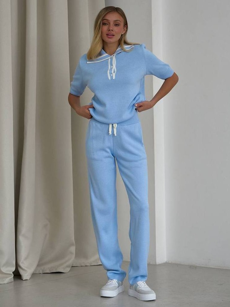 Замовити та купити трикотажний в'язаний жіночий брючний костюм з футболкою поло та прямими штанами повної довжини недорого можна в нас накладним платежем з передоплатою на доставку. Відправляємо в Київ, Дніпро, Львів, Запоріжжя, Одесу, Івано-Франківськ, Полтаву, Черкаси та будь-який населений пункт України.