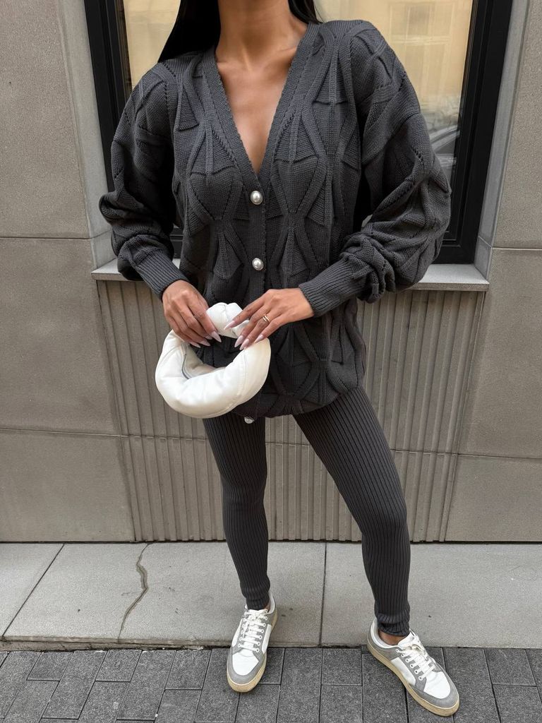 В'язаний кардиган і лосини з мериносової вовни та кашеміру створені для тих, хто цінує поєднання стилю, затишку і преміальної якості. Кардиган має глибокий V-подібний виріз горловини, що дозволяє підкреслити лінію декольте або поєднувати його з топами та футболками. Елегантні гудзики, виконані у вигляді перлин, додають образу вишуканості та ніжності, перетворюючи цей елемент гардеробу на універсальний варіант для будь-якої нагоди.