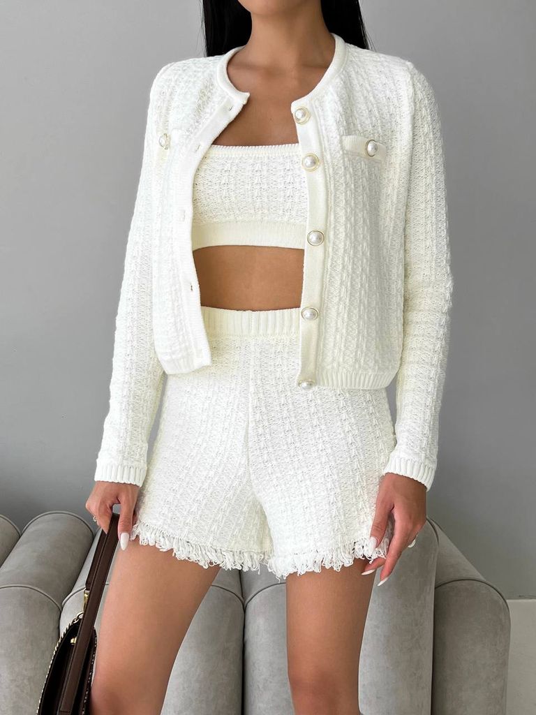 В'язаний костюм 3-в-1 у стилі Шанель — це елегантний комплект для стильних образів на будь-який сезон. Комплект включає шорти, кроп-топ та кардиган, виконані в техніці в'язання, що нагадує легендарну твідову тканину від Шанель. Преміальна якість тканини забезпечується складом: 20% кашемір, 30% бавовна та 50% віскоза, що робить його комфортним та довговічним. Цей костюм підходить як для щоденних прогулянок містом, так і для створення трендових образів на вечір. Доступний у двох кольорах: молочному та чорному, він стане основою гардероба для модниць, які люблять елегантність і комфорт.