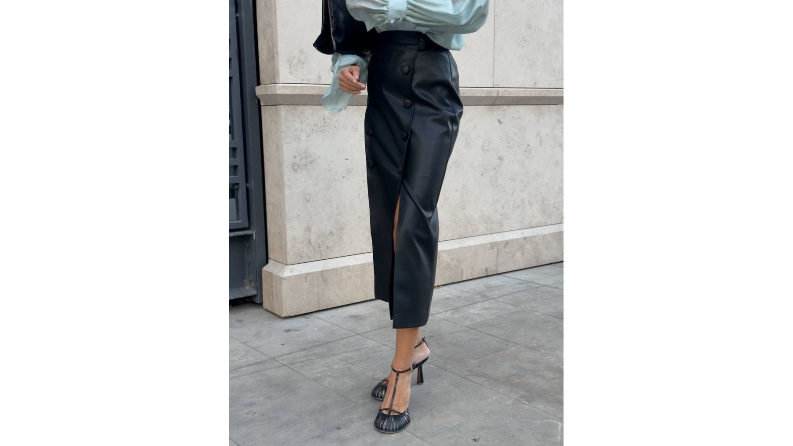 Спереду розташовані обтягнуті шкірою ґудзики, які йдуть симетрично з обох сторін, формуючи ефект двобортності. Це дизайнерське рішення додає виробу складності та стилістичної глибини. А розрізи відкривають ніжки під час руху, залишаючи легкий натяк на відвертість і витончену привабливість. Такий баланс стриманості та граційності робить спідницю універсальною: вона однаково ефектно виглядає з сорочкою, гольфом, жакетом чи об’ємним светром. Еко-шкіра з замшевою підкладкою забезпечує комфорт навіть у прохолодну пору року, не липне до тіла та дарує приємні тактильні відчуття. Модель стане ключовим елементом гардероба для тих, хто цінує лаконічний дизайн, якість і вміння підкреслити індивідуальність через деталі.